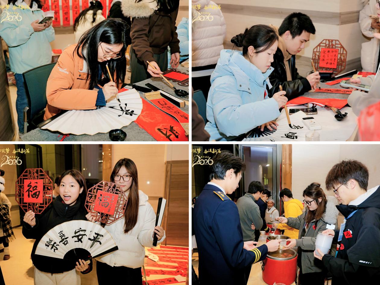 现场,校学生会、书法协会的同学们为师生写春联、送汤圆,传递新年的祝福和美好的祝愿。