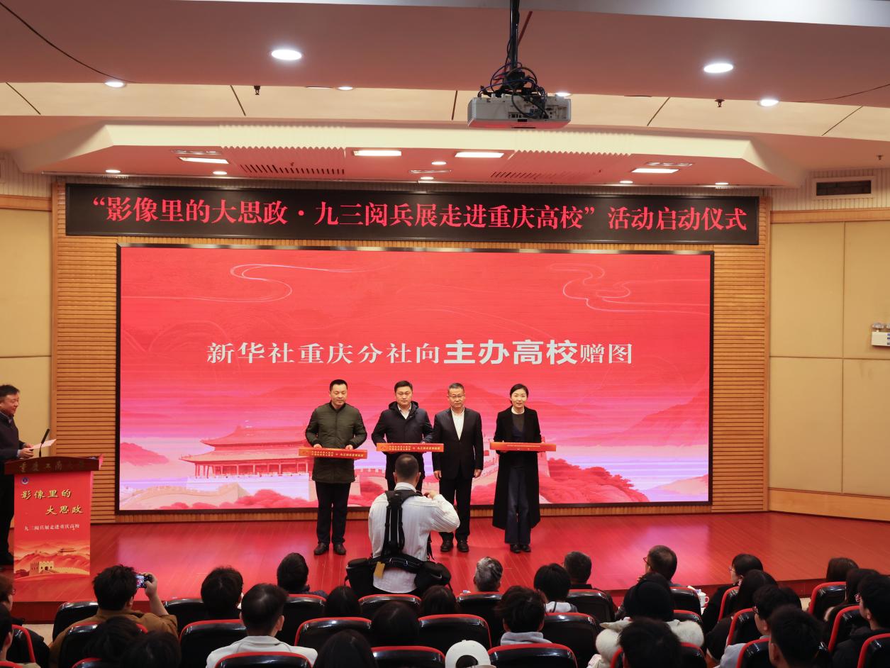 仪式现场还举行了赠图环节。王金涛代表新华社重庆分社向重庆工商大学、重庆第二师范学院、重庆建筑工程职业学院三所主办高校赠送“九三阅兵展”影像作品集,向中国农业银行重庆市分行赠送影像作品集。