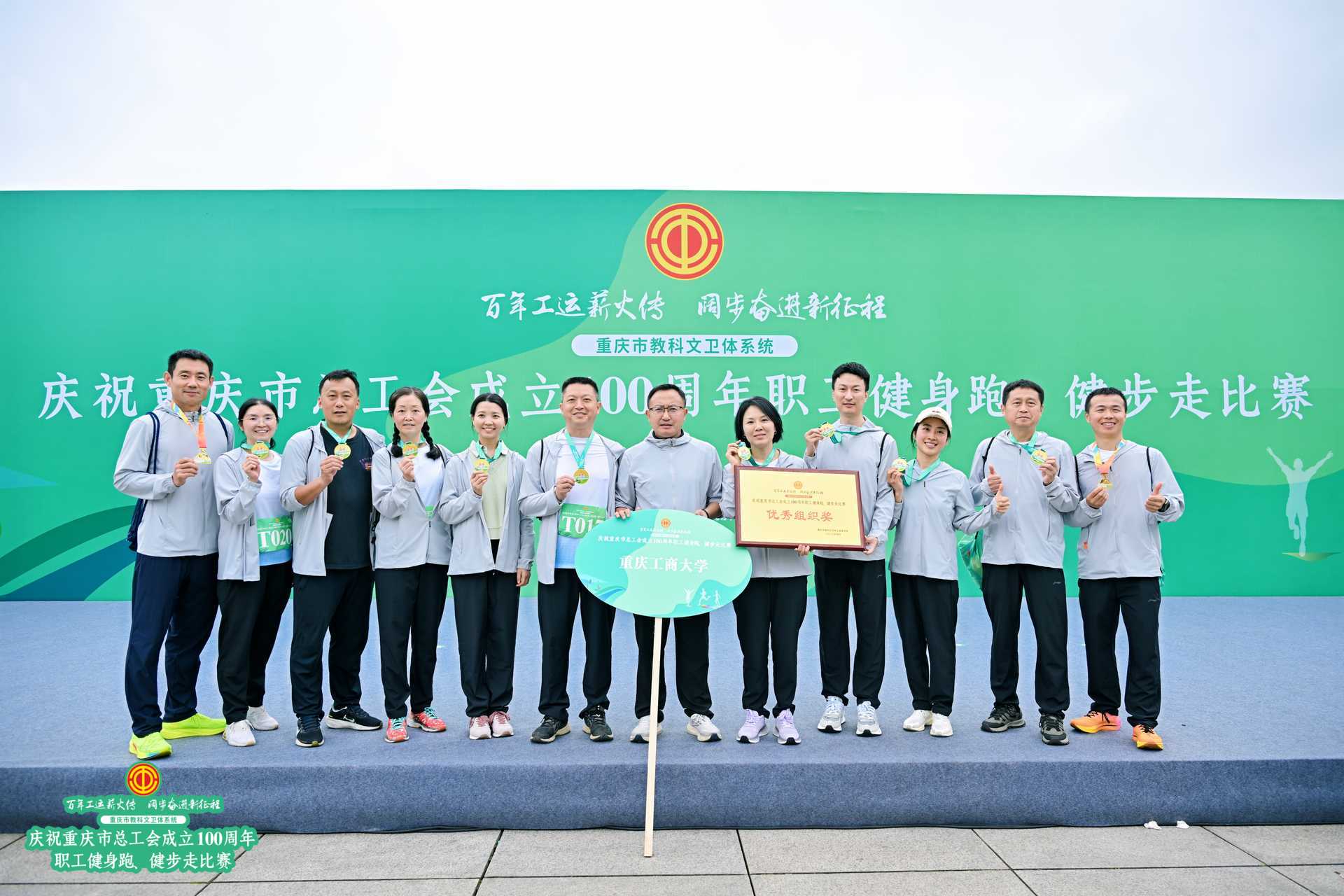 春和景明,逐梦前行;百年工运,薪火永续。4月15日,由重庆市教科文卫体工会主办的“百年工运薪火传 阔步奋进新征程”庆祝重庆市总工会成立100周年职工健身跑、健步走比赛在重庆两江新区中央公园鸣枪开赛,重庆工商大学代表队表现突出,荣获比赛“优秀组织奖”,体育学院工会于晓东获男子组第三名,机关工会周良勇获男子组第六名。