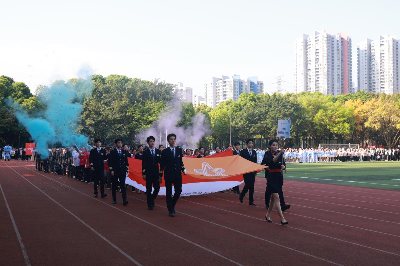腾跃拼搏彰锐气,携手奋进向荣光。入场式上,伴随着激昂的《运动员进行曲》,国旗护卫队迈着铿锵有力、整齐划一的步伐率先入场,紧随其后,会旗队、彩旗队和各学院及工会方队依次入场,他们精神抖擞、气宇轩昂,铿锵的步伐踏响时代强音,自信的姿态彰显青春力量,充分展现了重工商大师生奋发向上、勇攀高峰、追求卓越的精神面貌。