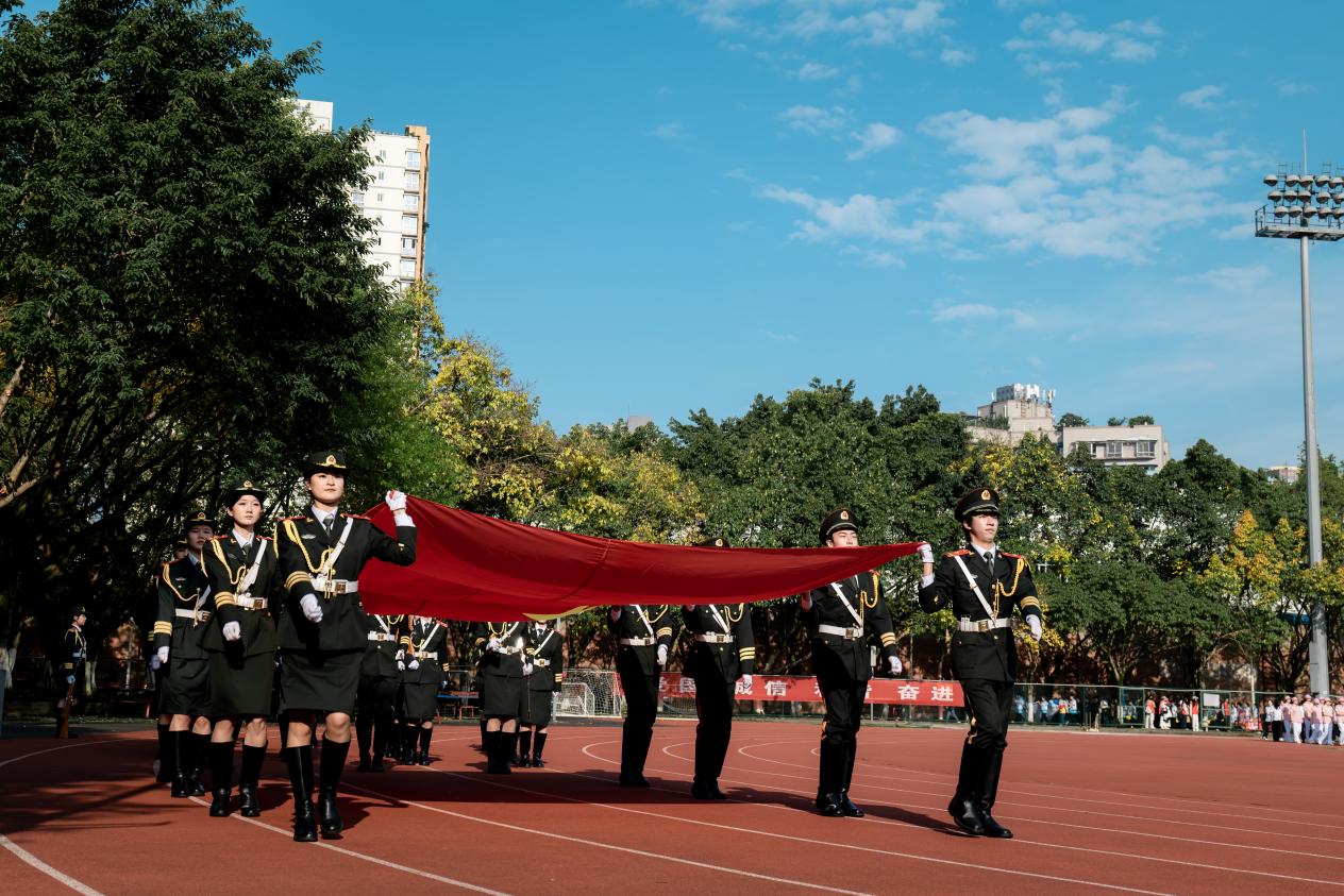 文学与新闻学院李奕涵步履坚定、意气昂扬,护送运动会会旗入场就位。