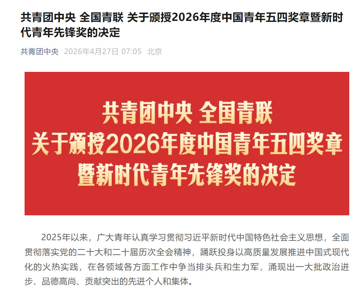 4月27日,共青团中央、全国青联发布《关于颁授2026年度中国青年五四奖章暨新时代青年先锋奖的决定》,我校公共管理学院2023级公共管理硕士(MPA)学员、副班长刘庆中荣获“2026年度新时代青年先锋”称号。