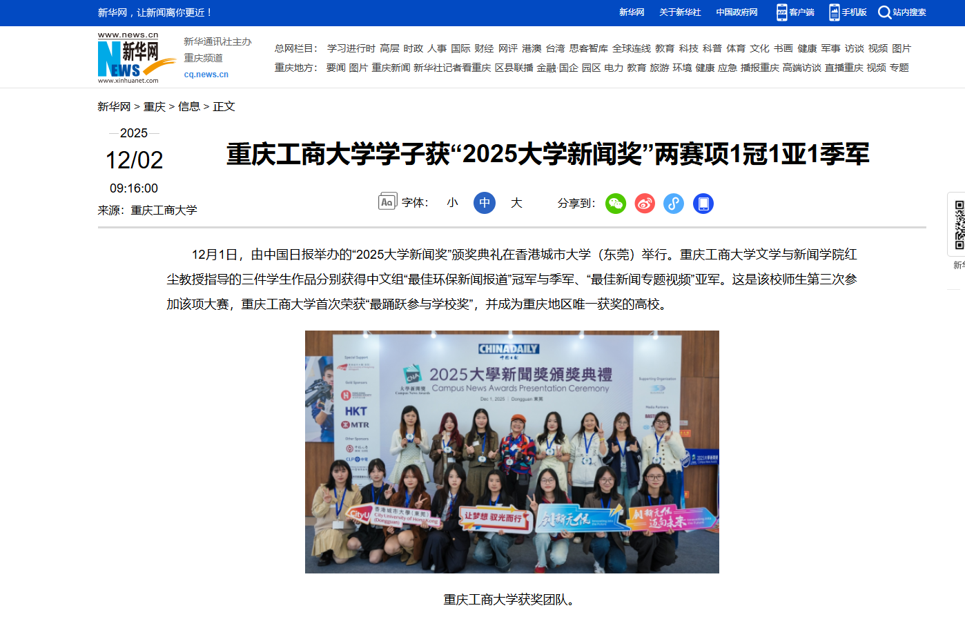 新华网:《重庆工商大学学子获“2025大学新闻奖”两赛项1冠1亚1季军》