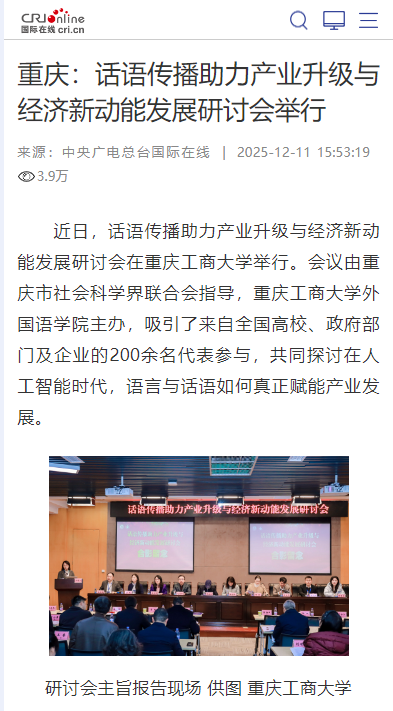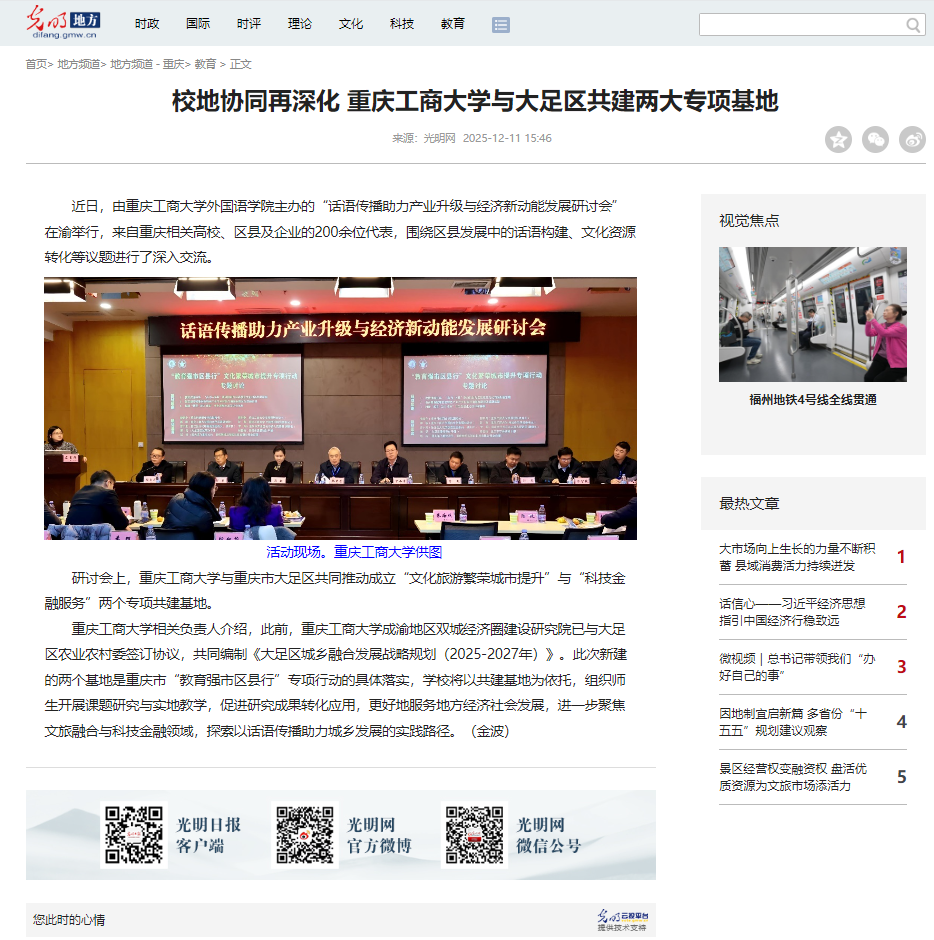 光明网以“校地协同再深化 重庆工商大学与大足区共建两大专项基地”为题,央广网以“外语学科服务区域发展 重庆探索话语传播与区县经济新路径”为题,中央广电总台国际在线以“重庆:话语传播助力产业升级与经济新动能发展研讨会举行”为题,中国新闻网以“话语传播如何驱动产业新动能?重庆这场研讨会给出了答案”为题纷纷关注报道。截至目前,相关报道的阅读量已超过91.1万人次。