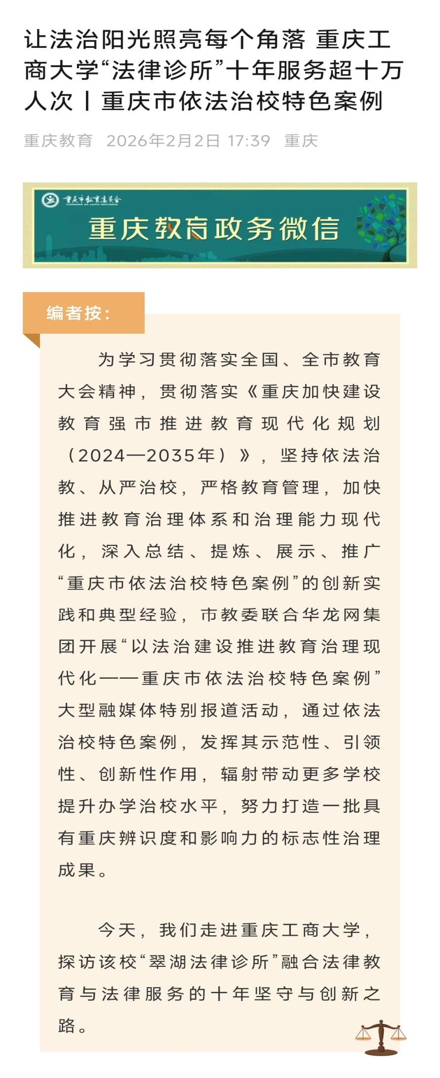 2.重庆教育:让法治阳光照亮每个角落 重庆工商大学“法律诊所”十年服务超十万人次丨重庆市依法治校特色案例