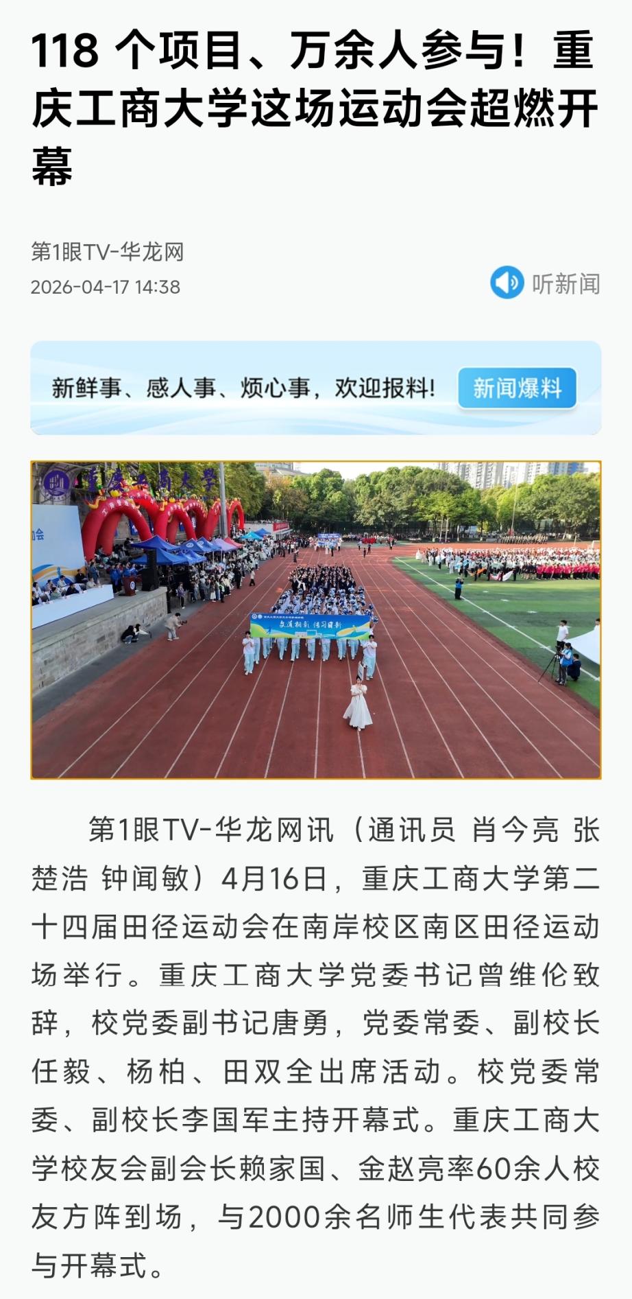重庆日报—新重庆客户端以“图片新闻|高校运动会‘AI含量’高”“视频新闻|高校运动会‘AI含量’高”为题,华龙网以“118 个项目、万余人参与!重庆工商大学这场运动会超燃开幕”为题作报道。