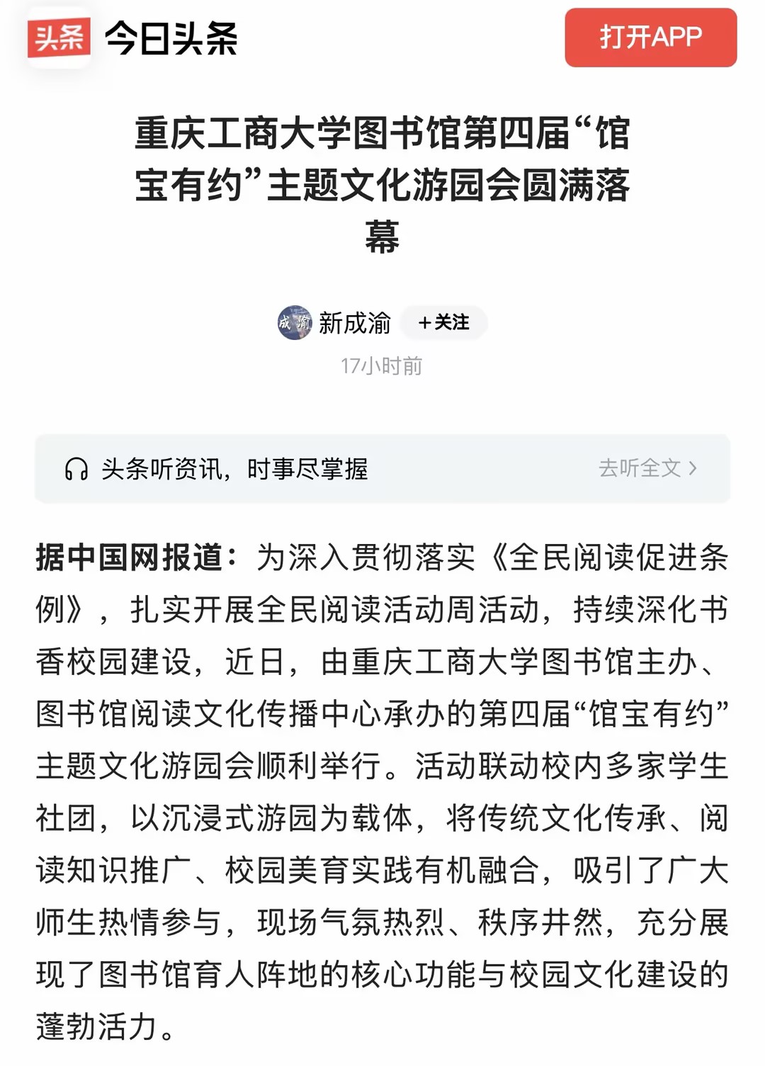 1、 今日头条:《重庆工商大学图书馆第四届“馆宝有约”主题文化游园会圆满落幕》