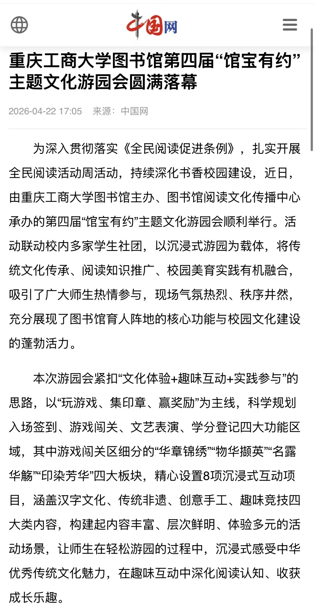 4、中国网:《重庆工商大学图书馆第四届“馆宝有约”主题文化游园会圆满落幕》