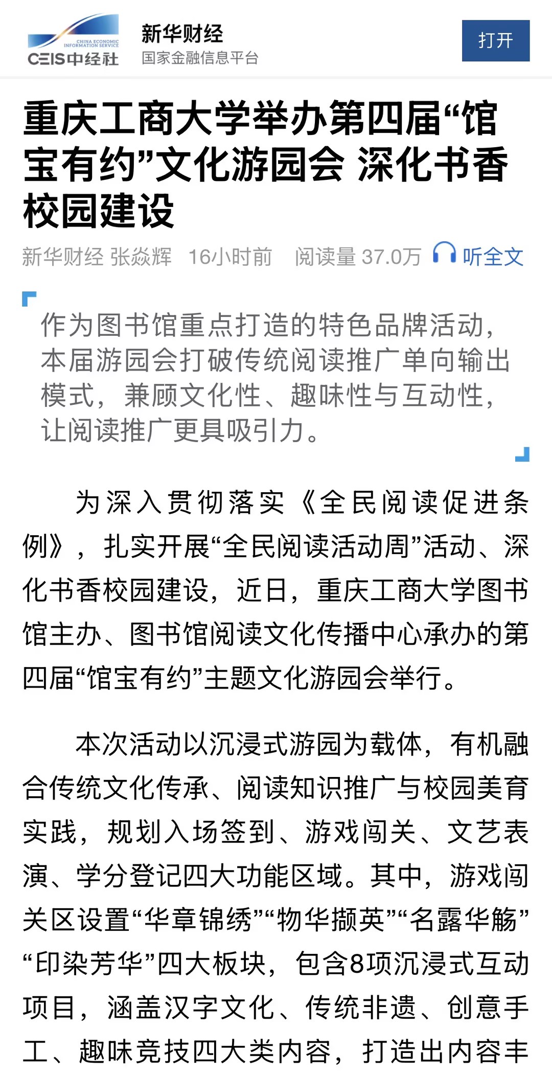 2、 新华财经:《重庆工商大学举办第四届“馆宝有约”文化游园会 深化书香校园建设》